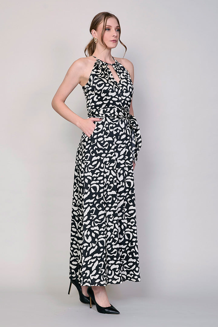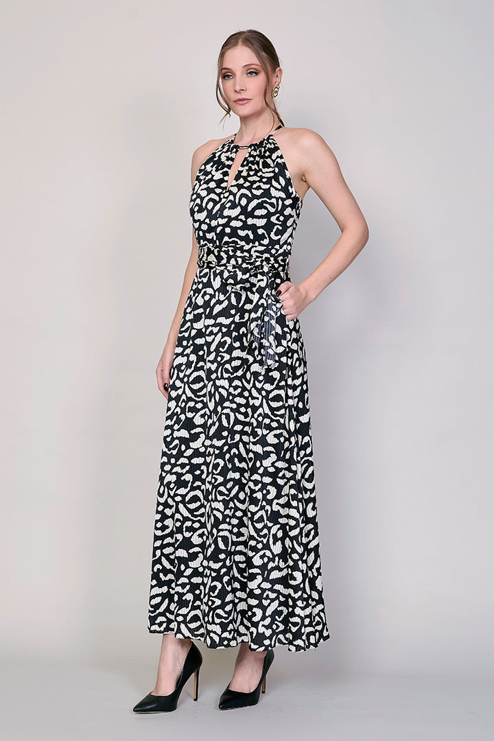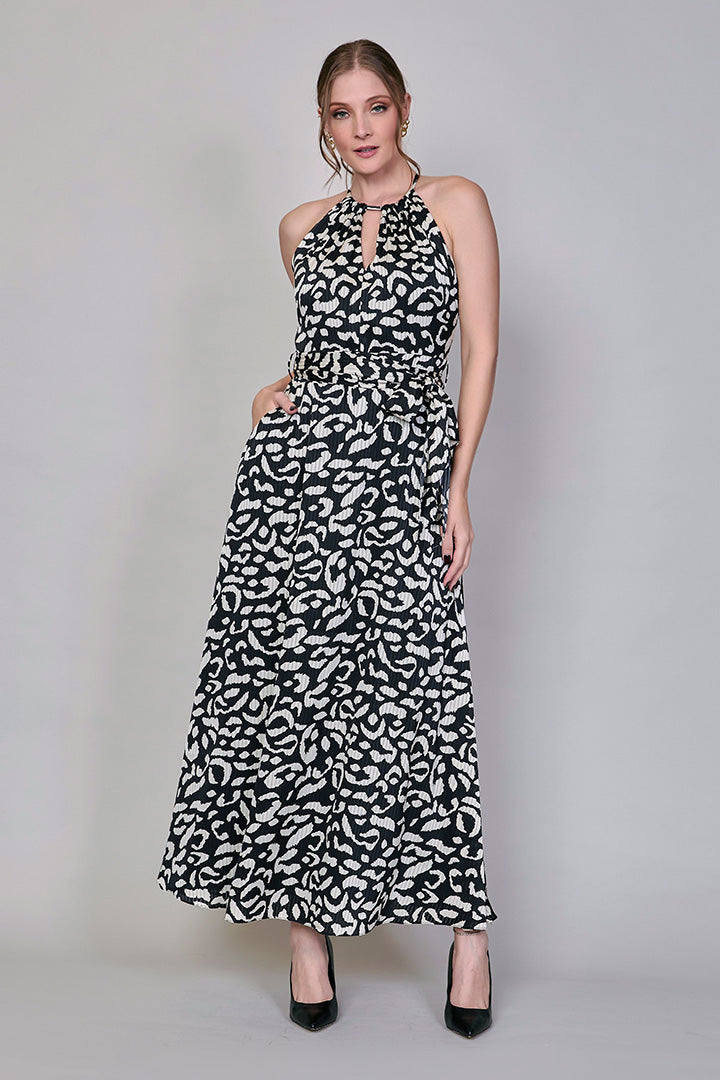Descripción: Maxivestido tipo halter estampado color negro con cinturón