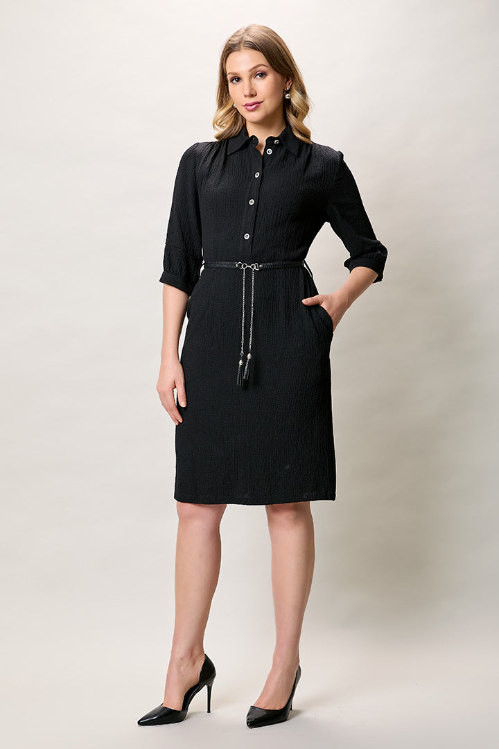 Vestido negro tipo camisero manga 3/4 con cinturón