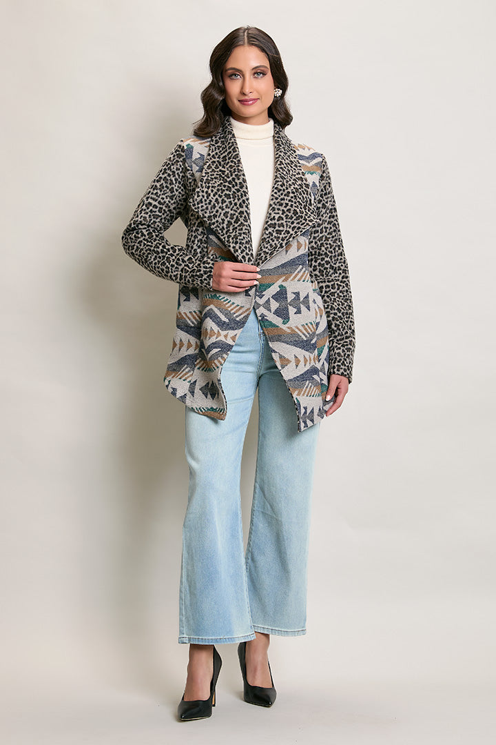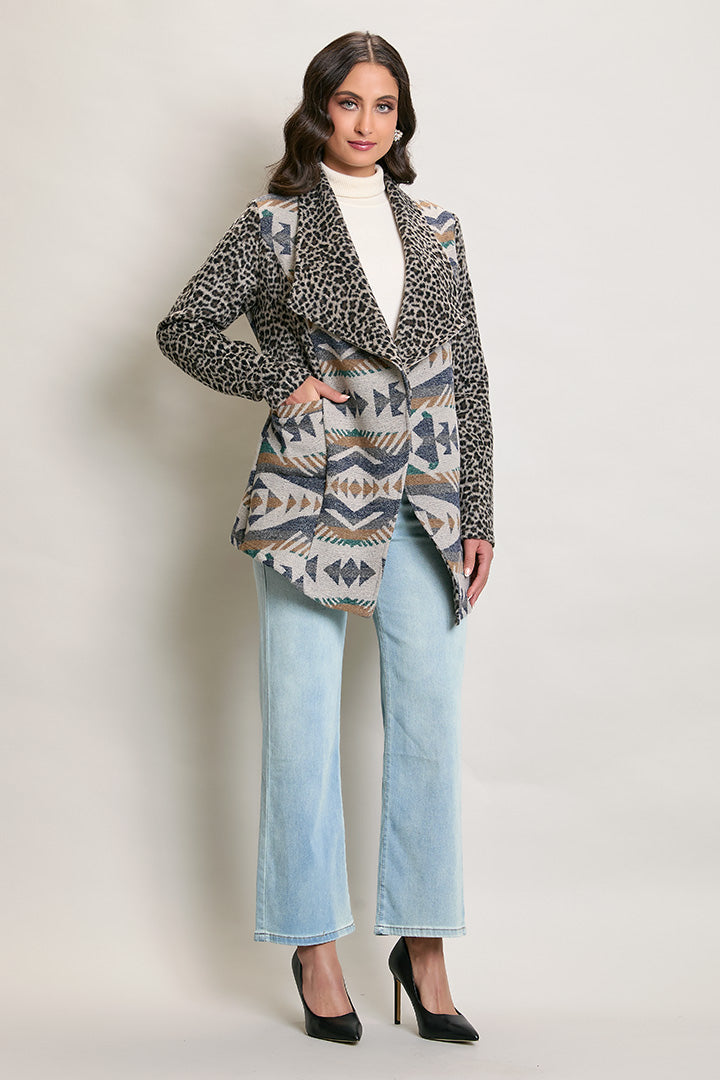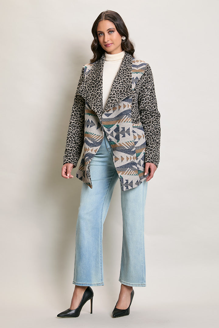 Descripción: Abrigo invernal color azul estampado corte irregular.