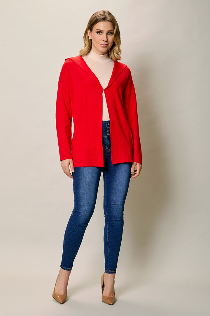 Descripción: Suéter largo casual color rojo con bolsillos y gorro.